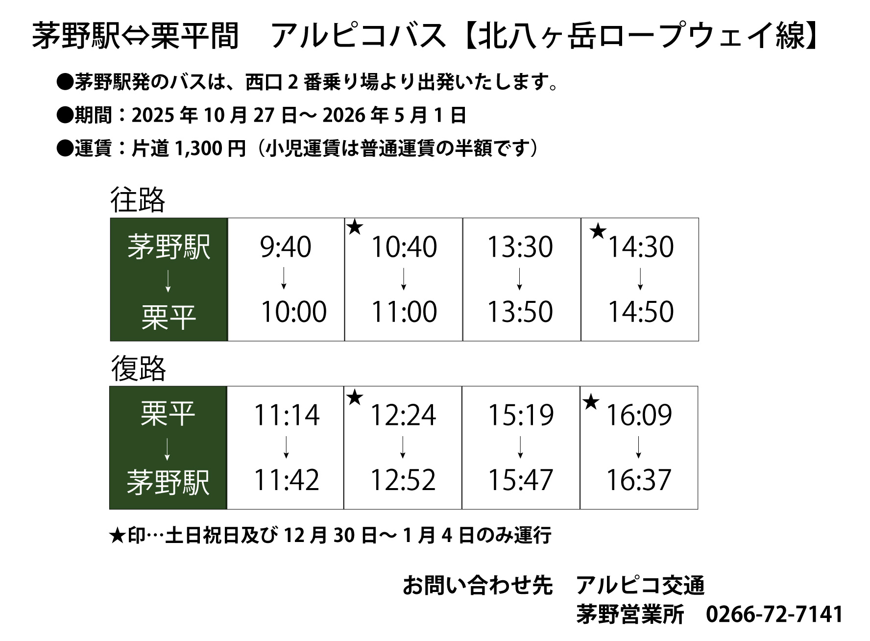 名古屋駅より中央本線塩尻駅で乗り換え、茅野駅下車。(約2時間30分) 茅野駅より北八ヶ岳ロープウェイ行きバス(約25分)で栗平バス停下車、目の前です。♦ バス時刻 ♦