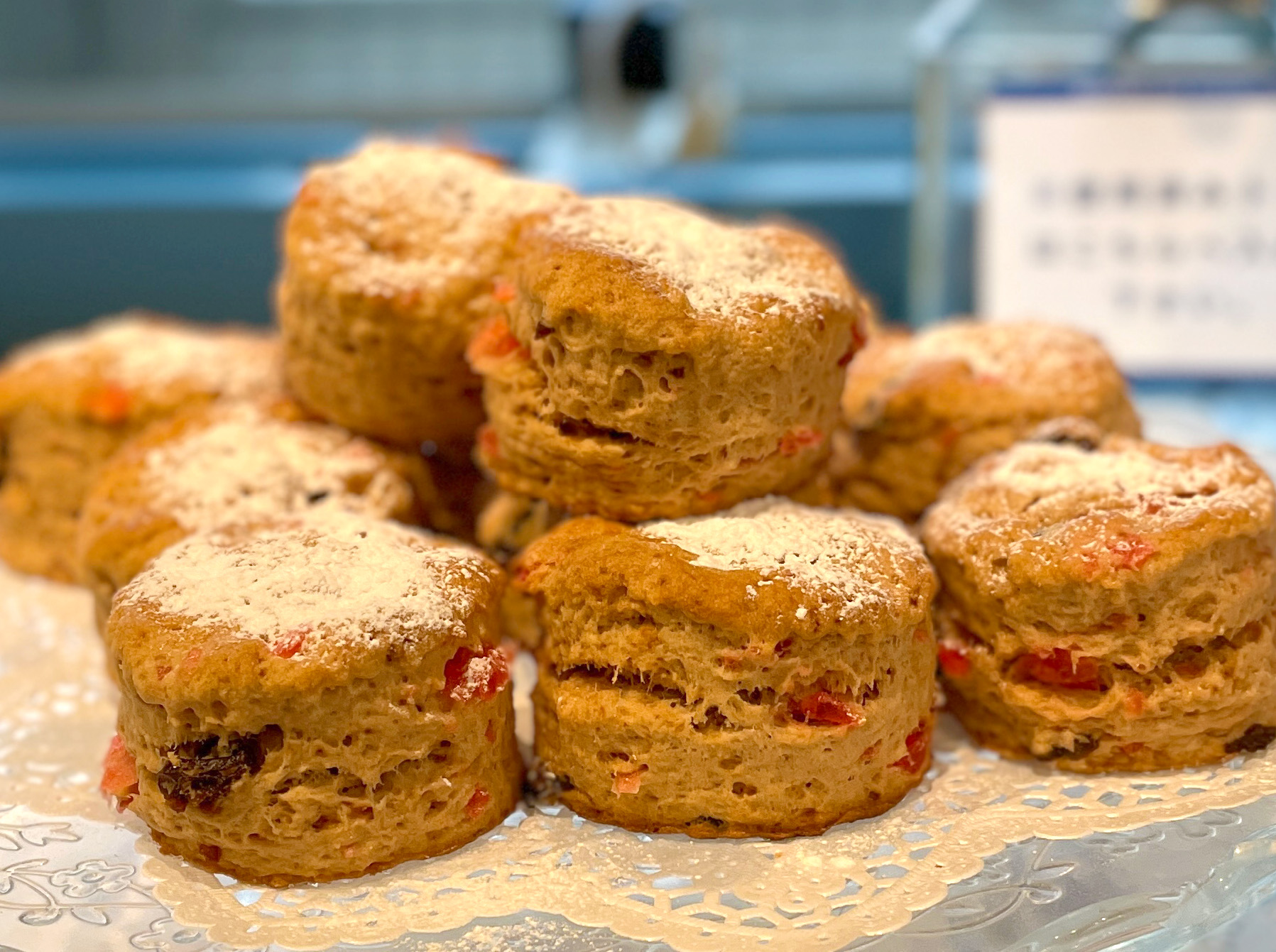 シナモンの生地にサクランボの砂糖漬けとレーズンがまぜこまれた季節限定のスコーン