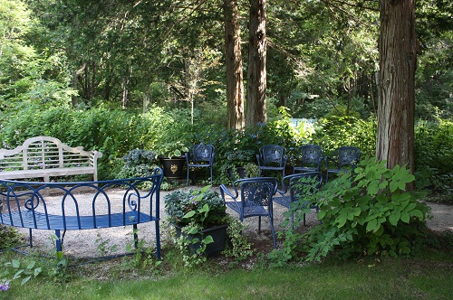 22年が経過したケイ山田の庭は、背の高い木々が随所にあり、木陰がたくさんございます。木の足元には、みなさんがゆっくりとくつろげるように、ケイ山田のディレクションのもと美しく見えるように留意しながら、たくさんのベンチを置いています。