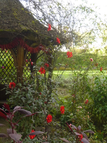 満開を迎えたダリアや、こぼれ落ちるように赤く熟れたローズヒップなど、まだまだカラフルな世界が広がっている、バラクライングリッシュガーデン。