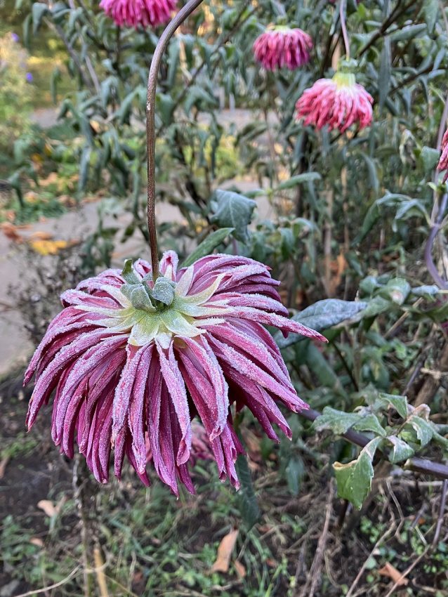 昨日まで美しく咲いていたダリアも、一晩にしてフローズンダリアに。カチカチに凍りついてしまいました。
