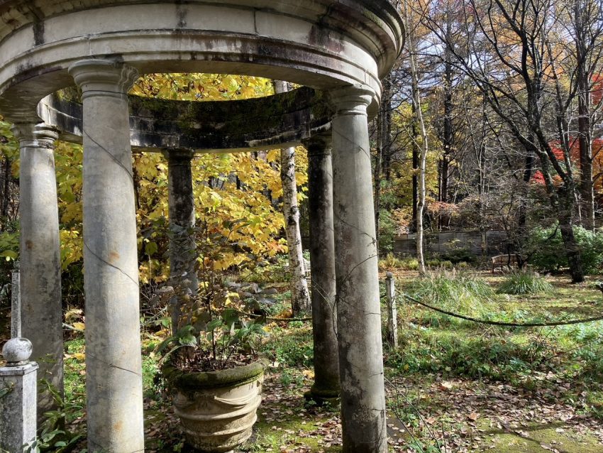 チューリップツリーの黄葉とパビリオン