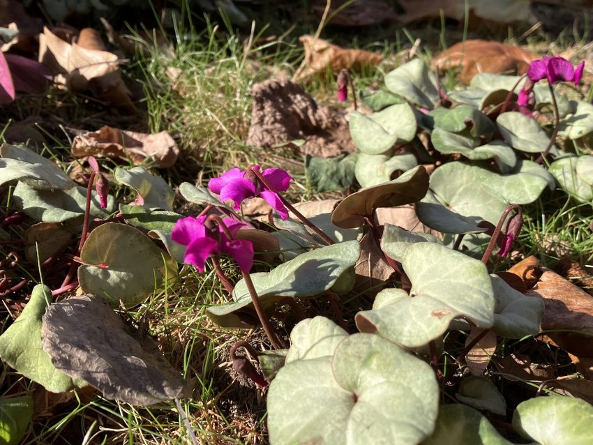 お庭はもちろん、ガクッとお花は少なくなりましたが、クリスマスローズに原種のシクラメンが、寒さの中で健気に咲いていました。