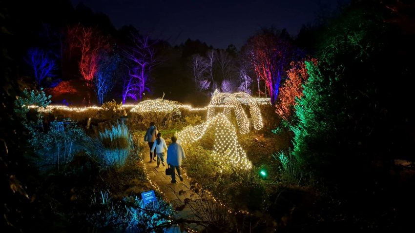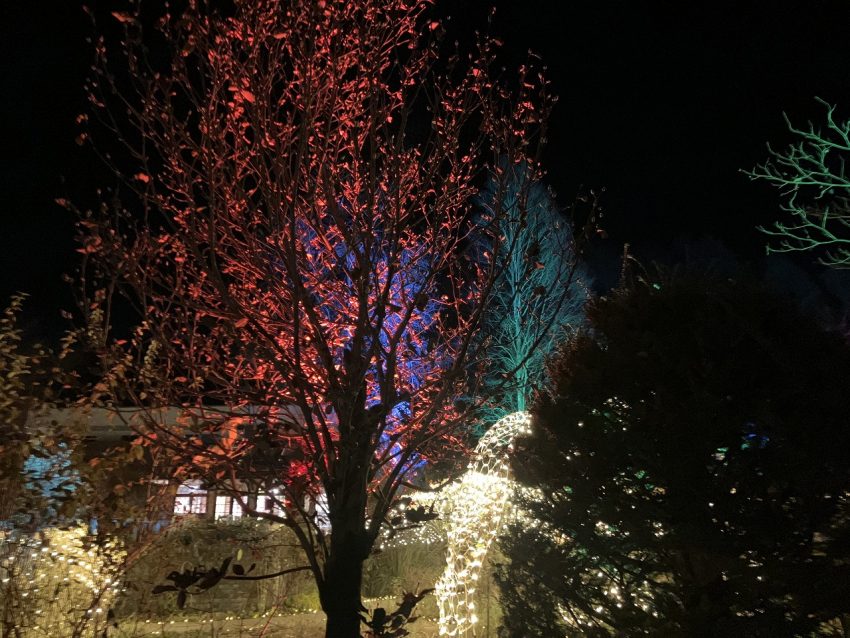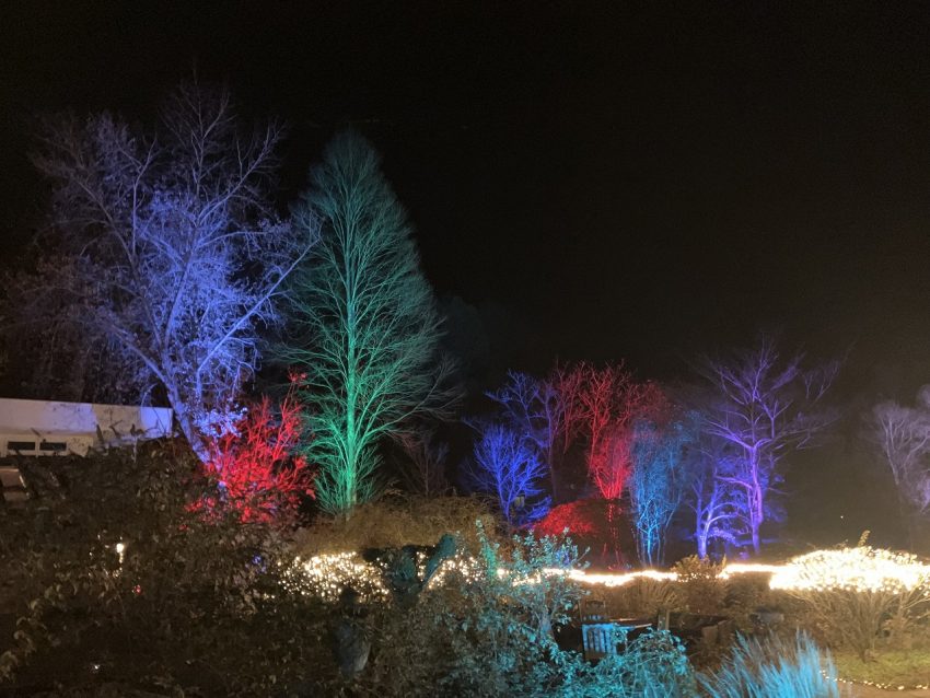 夜空に自然な樹木のシルエットが浮かび上がる、英国式のイルミネーション。