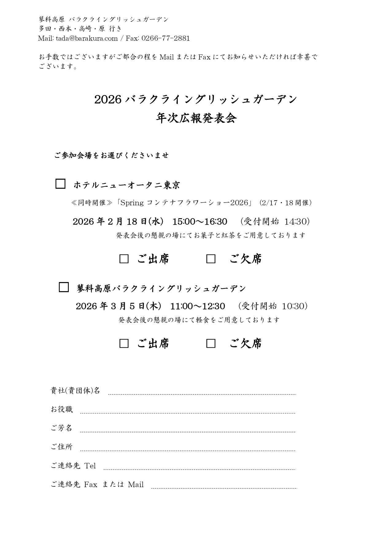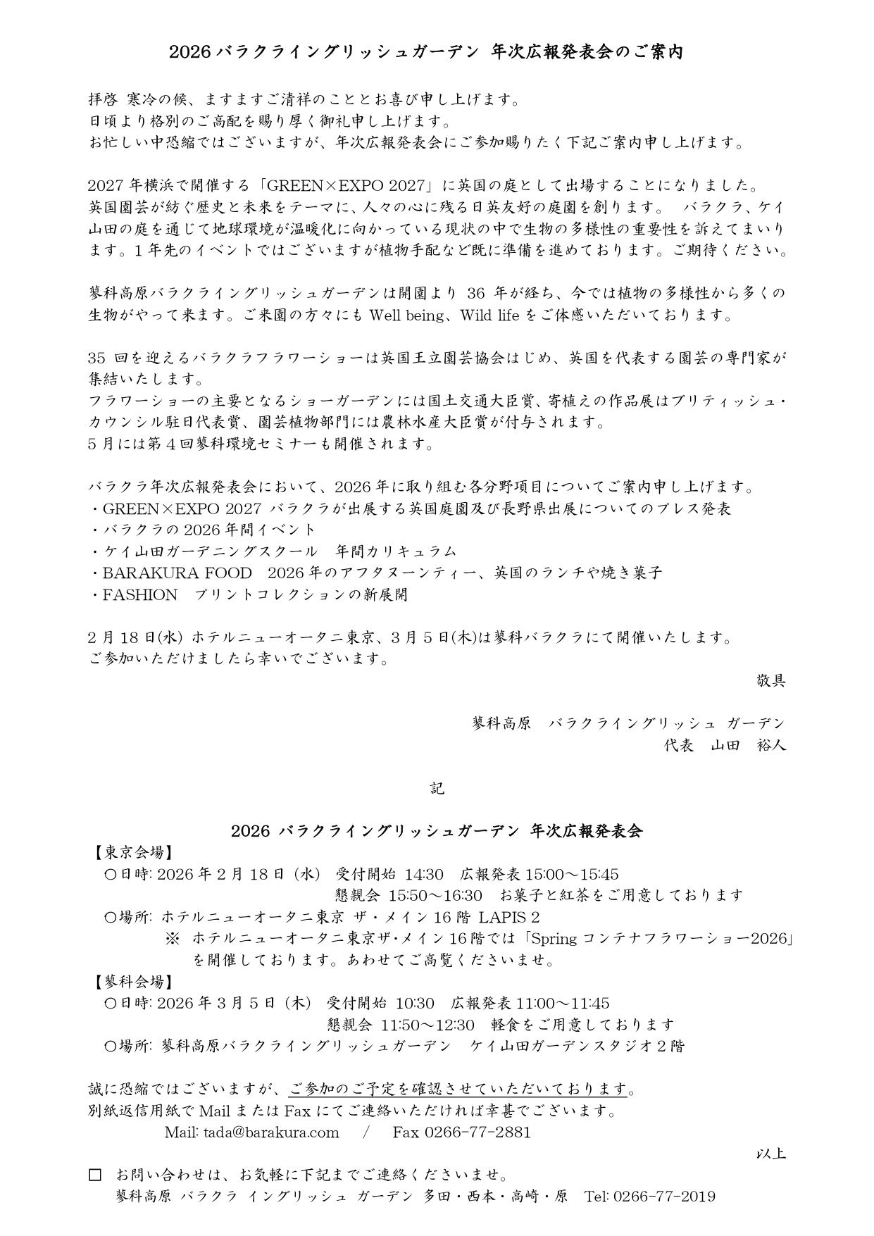 蓼科高原バラクライングリッシュガーデン及びケイ山田のファッションブランド・バラ色の暮し の2026年度の主な活動や新たな取り組みについて、マスコミ、関係各官公庁・団体、旅行・観光会社、園芸関係団体・企業、お取引先の皆さまに向けて「年次広報発表会」を下記の日程で開催いたします。