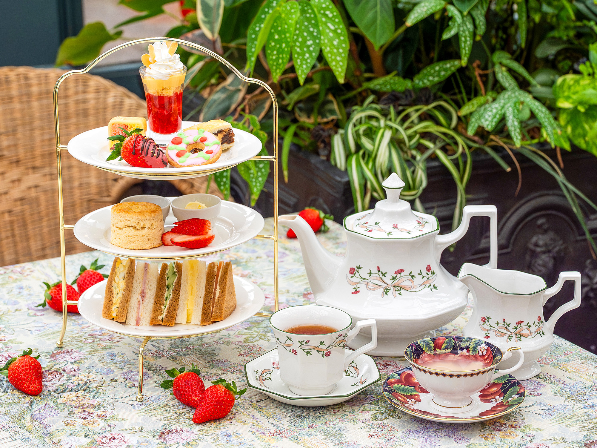花々が美しく咲く庭園のテラス席や日本初のコンサバトリーカフェで、紅茶と共に軽食やお菓子を楽しむ優雅なお茶会。上品に彩られたお菓子、伝説のスコーン、リニューアルしたサンドウィッチをご用意いたしました。