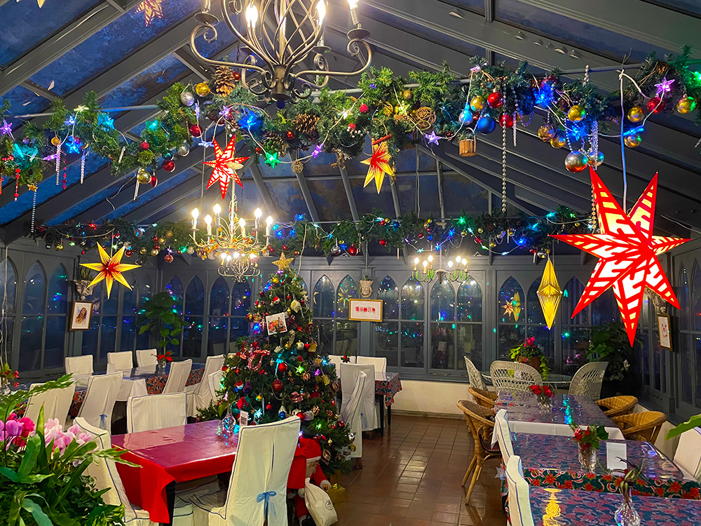 園内入口すぐのパティオと庭園内にクリスマスツリーが飾られ、園内は華やかな装飾とクリスマスグッズでいっぱい!